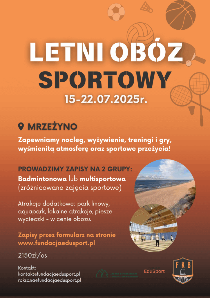 Klub Badmintona Izabelin oraz Fundacja EduSport zaprasza na pełny emocjonujących wydarzeń LETNI OBÓZ SPORTOWY 🏸🏀⚽ w Mrzeżynie- nad morzem 🌊: